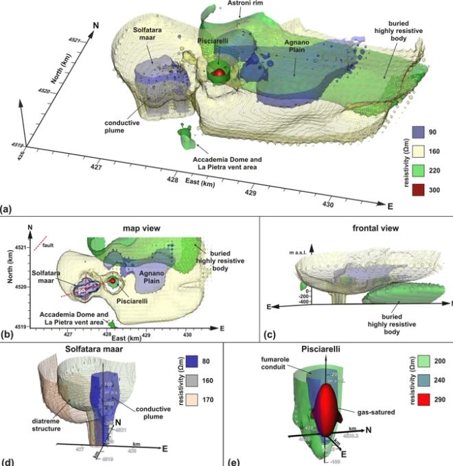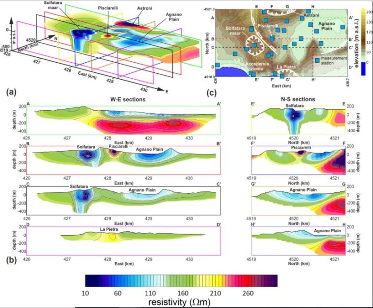Lo studio, pubblicato sulla rivista “Scientific Reports” ha ricostruito in 3D il bacino sotterraneo della caldera dei Campi Flegrei, che presenta una forma simile a quella di un imbuto. La sua forma favorisce l’accumulo di fluidi che, nel caso di una ripresa delle attività vulcaniche, potrebbero aprire nuove bocche eruttive. Per avere le immagini del supervulcano è stata utilizzata la tecnologia tomografia di resistività elettrica wireless che ha permesso di ottenere un modello tridimensionale dei primi 500 metri della caldera flegrea. Nello specifico, tale tecnologia misura la resistenza che i materiali del sottosuolo offrono al passaggio di un certo grado di corrente elettrica, permettendo in tal modo di identificare le strutture sepolte.