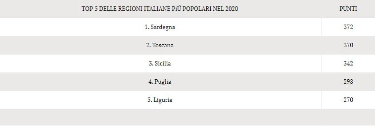 Nella Top 5 ci sono 3 regioni del Sud: Sardegna, Sicilia e Puglia. Un bel risultato per il Mezzogiorno, che si conferma una meta molto amata dai viaggiatori.