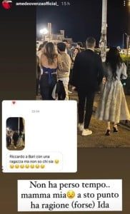 Solo qualche ora fa, Riccardo Guarnieri è stato avvistato a cambiare è stato visto passeggiare al fianco di un' altra donna per le vie di Bari: i due camminavano tenendosi per mano ma senza scambiarsi effusioni. La segnalazione è stata fatta ad Amedeo Venza che ha espresso la sua opinione in merito allo scatto: "Non ha perso tempo, mamma mia a sto punto aveva ragione (forse) Ida". Con queste parole l'esperto di gossip si riferisce alle accuse che la dama siciliana ha rivolto a Riccardo Guarnieri di aver usata solo per guadagnare il centro dello studio ed ottenere così più visibilità "Non sei chiaro. Mi vuoi intortare solo con le parole. Io sono andata a fare terapia e ci andrò di nuovo perchè fa bene, ma te la consiglio. E’ voluto uscire solo per fare quattro chiacchiere. Non hai rispetto Vergognati per quello che mi hai detto. Qui carezze e parole dolci e poi..."