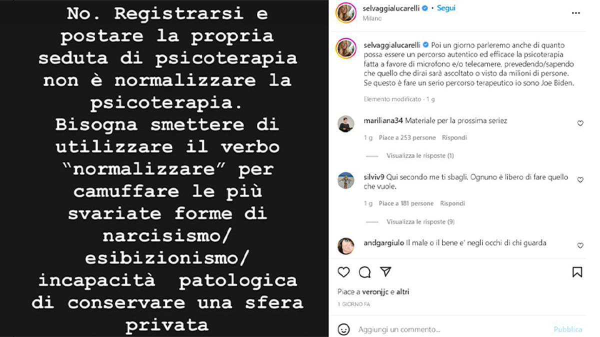 In un post pubblicato su tutti i suoi profili social, Selvaggia Lucarelli arringa la scelta di Fedez come insensata, atta solo ad ottenere visibilità attraverso un argomento molto delicato. La giornalista sottolinea che una seduta di terapia da uno psicologo è un momento estremamente privato e dovrebbe restare tale in qualunque occasione "No. Registrarsi e postare l’audio nella propria seduta di psicoterapia non è normalizzare la psicoterapia". Non solo. La giornalista rincara la dose, lanciando evidenti accuse nei confronti del cantante: "Bisogna smettere di usare il verbo normalizzare per camuffare le più svariate forme di narcisismo/esibizionismo/incapacità patologica di conservare una sfera privata".