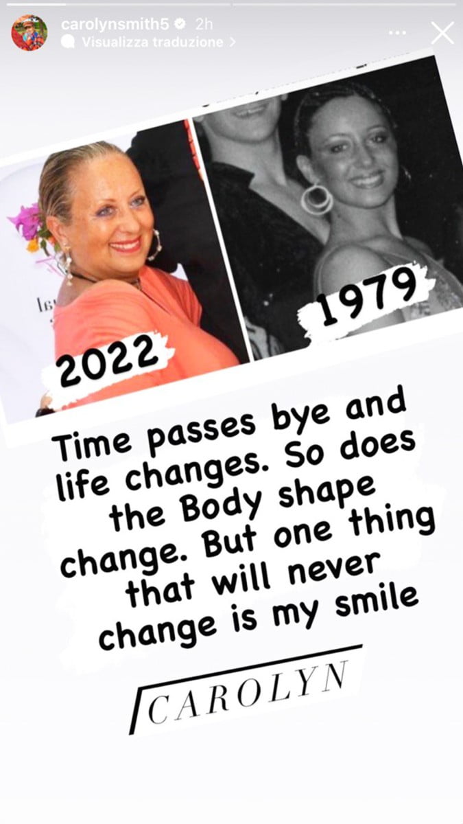Carolyn Smith su Instagram vanta un profilo seguitissimo: ha 297mila follower con i quali condivide spesso istanti della propria vita tanto dal punto di vista professionale, quanto dal punto di vista privato. In tal senso, qualche giorno fa, è sbucato tra le sue storie uno scatto meraviglioso datato 1979. All'epoca la britannica, classe 1960, aveva appena 19 anni. Per la verità la foto pubblicata è un collage: a sinistra lei oggi, a destra lei ieri. È sempre bellissima e con lo stesso sorriso di allora come lei stessa afferma in una scritta sovra impressa, la cui traduzione è: "Il tempo passa e la vita cambia, così cambia anche la forma del corpo ma una cosa non cambierà mai: il mio sorriso." Oltre alla parentesi gioiosa sul suo volto, anche lo stile della coreografa è rimasto invariato: basti guardare gli enormi orecchini che porta in entrambe le immagini. In ogni caso è sempre bellissima.