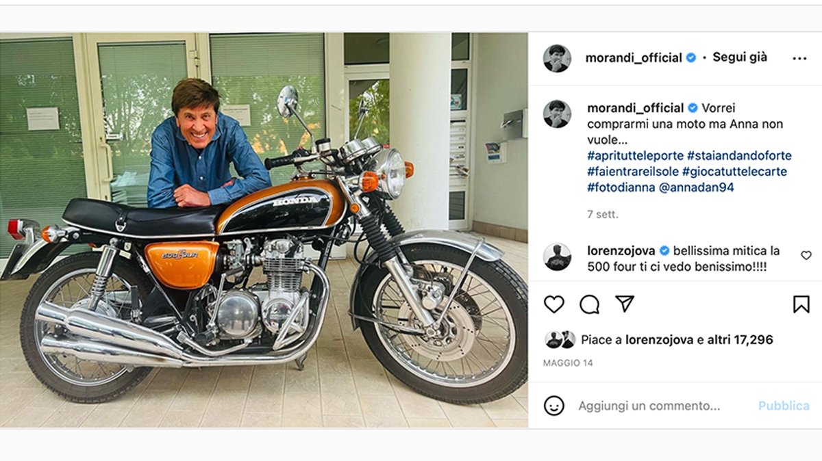 Come dicevamo in precedenza, oltre ai suoi famosissimi brani, è molto noto anche l’amore per la sua seconda moglie Anna Dan. In una foto pubblicata sui suoi social, però, il buon Gianni appare in compagnia di un nuovo amore. Stiamo parlando della Honda 500 Four che vediamo sotto: