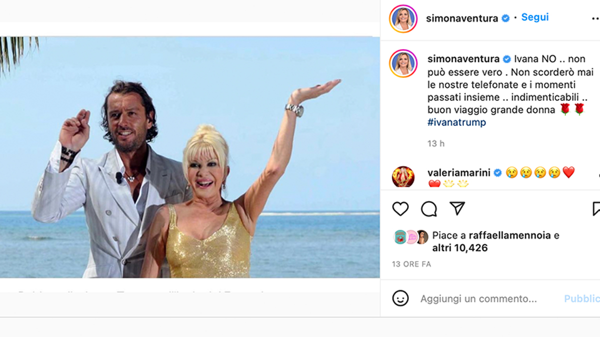 In un recentissimo post su Instagram, la Ventura ha manifestato il suo profondo cordoglio per la grande perdita. La sua cara amica Ivana Trump, infatti, è recentemente scomparsa per di un arresto cardiaco all’età di 73 anni. Stando alle parole della showgirl, le due pare fossero molto legate. Sembra infatti che passassero ore al telefono e che abbiano passato momenti indimenticabili insieme. Non ci rimane, allora, che unirci al dolore di Simona e sperare che possa affrontare il lutto con coraggio.