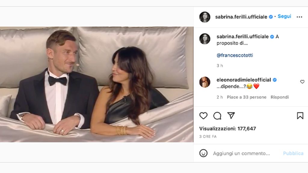 Sul suo profilo ufficiale Instagram, la bella e brava Sabrina Ferilli ha postato un breve video in cui figura, sotto le coperte, insieme al campione del mondo Francesco Totti. Niente di scioccante, però. La showgirl ha solo pubblicato un breve estratto di "HouseParty" in cui lei e il capitano hanno recitato in un divertente sketch televisivo. Con tutto il clamore attorno alla vicenda della separazione da Ilary, però, i like ovviamente sono davvero piovuti a frotte. Che la Ferilli abbia voluto comunicare qualcosa al buon Francesco? Chi può dirlo. Possiamo solo attendere curiosi. Noi, però, continueremo a tenervi aggiornati.