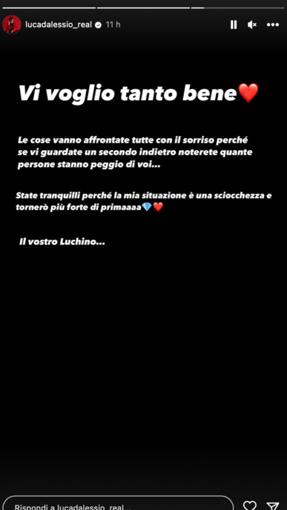 Poco dopo le 22 di giovedì 13 ottobre, Luca D'Alessio pubblica una foto in cui è steso su un lettino di ospedale. In didascalia scrive che per "comprovati motivi di salute" è costretto ad annullare il concerto di questa domenica a San Severo (FG). "Inutile dirvi quanto sia dispiaciuto ma allo stesso tempo sono sicuro di poter tornare a dare il massimo appena guarito". A fine post, 'Luchino' scrive che: "Non è nulla di grave" ma non specifica cosa gli sia successo. Dalla foto postata sui social, ha una flebo al braccio sinistro.