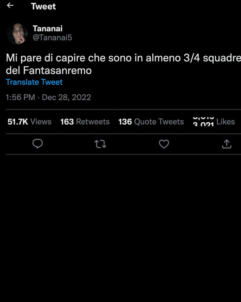 Da ultimo in classifica dello scorso anno a capitano al Fantasanremo è un attimo, almeno per il mondo Twitter che adora l'ironia del cantautore milanese. Dopo il successo estivo con Fedez e Mara Sattei il direttore artistico non poteva non coinvolgerlo per la sua nuova edizione. A quanto pare l'ultimo posto a Sanremo continua a portare grande fortuna ai cantanti come nel caso di Tananai che chiude un 2022 da record dopo la sua prima partecipazione a Sanremo.