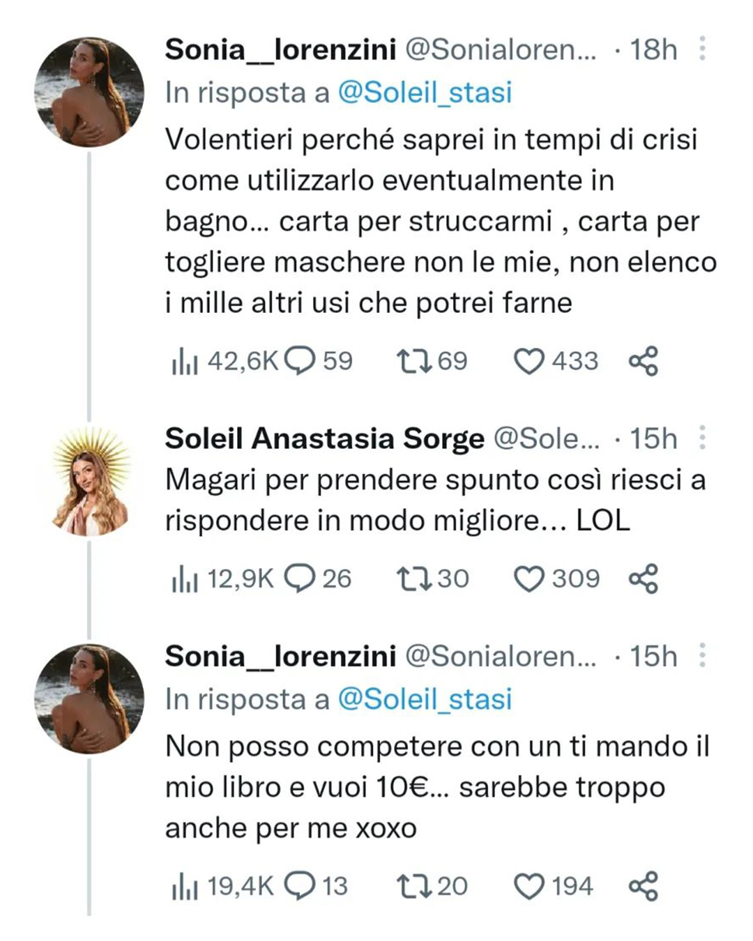 Uno scontro che non passa di certo inosservato. Secondo tantissimi utenti con la sua risposta Soleil e soprattutto con l'intento di voler mandare alla Lorenzini il suo libro, le sta dando indirettamente della str**a. Un'osservazione che subito riporta anche il re del gossip Amedeo Venza.