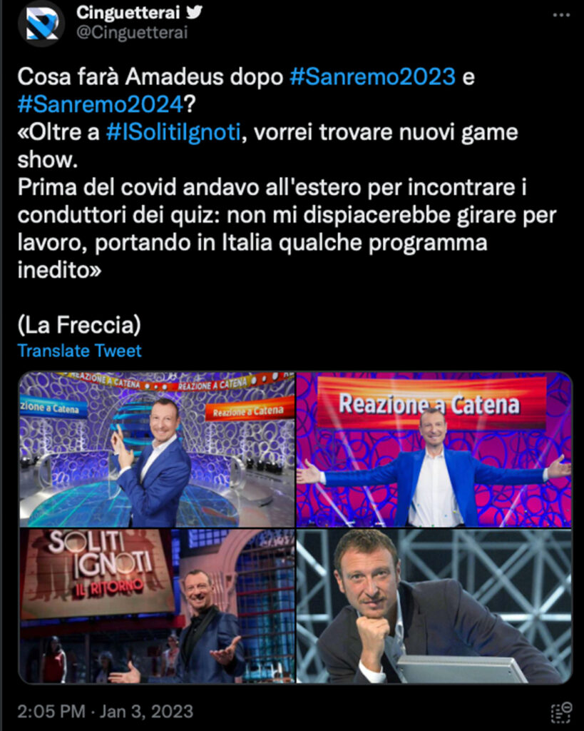 Amadeus però è prontissimo a ricominciare dopo gli anni trascorsi a servizio del Festival e lo farà proprio partendo dall'estero. Il conduttore ha dichiarato che gli piacerebbe tornare alla ricerca di game show e programmi famosi nel mondo e ancora sconosciuti nella nostra televisione. Come possiamo vedere da questo post il marito di Giovanna Civitillo non ha intenzione di lasciare i Soliti Ignoti a cui è particolarmente affezionato ma potrebbe arrivare con nuovi show tutti da scoprire. Cosa ci riserverà in futuro? Intanto possiamo goderci il suo successo all'Ariston per altre due edizioni e poi sperare che non resti troppo a lungo lontano dalla televisione italiana.