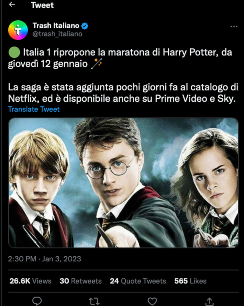 Cominciamo subito dalla tv in chiaro, dal 12 gennaio Italia 1 ha deciso di ricominciare con la maratona di Harry Potter e tutti i film saranno nuovamente trasmessi. Un successo che riappare a Mediaset considerando l'esplosione di share dello scorso anno. Ma c'è un'altra buona notizia, Potter è disponibile anche su Netflix. La piattaforma raccoglie un bacino di utenti molto vasto ed è per questo che i fan si sono scatenati. A questo si aggiunge anche la presenza di tutti i film su Sky e Prime Video, insomma da oggi sarà davvero impossibile resistere al fascino di Hogwarts.